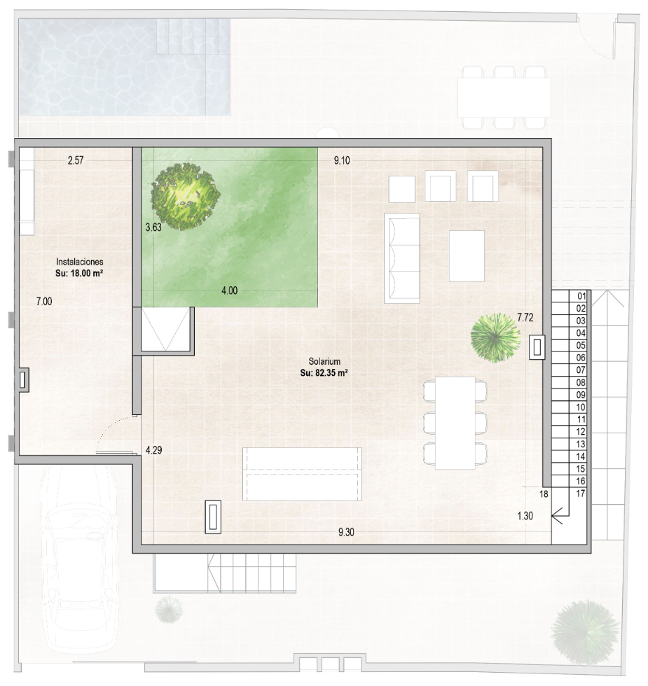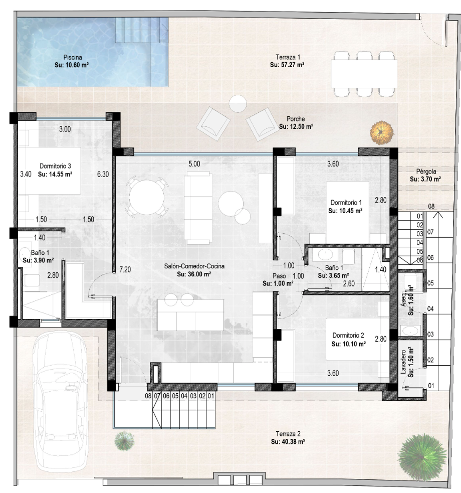 Fantastic location, easy walking distance to town centre with restaurants and bars, only 2 km from nearest golf course and 15 minutes drive to beaches.Comes fully furnished with a lot of extras.The villa comes with off road parking.It has a 36 m2 lounge with open kitchen with lovely breakfast bar and all white goods included. Very light room as 5 m glass wall (with doors) with views to the garden and pool.On one side of the lounge is the "master" with en-suite bathroom, and access via glass doors to the garden. On the other side of the lounge is the other 2 bedrooms and the 2nd bathroom. Both bedrooms got build in wardrobes and glass doors to the terrace.Outside are terraces on both sides of the villa. One side got the private pool and staircase to the massive 82 m2 solarium.Under the staircase is a toilet and utility area (for washing machine etc).Villa comes with motorised blinds and video intercom.The villa got installations for: ducted A/C, electric car charger, heated pool and solar panels.Sucina is a really nice town, lovely church and plaza. Got absolutely everything including a large selection of bars and restaurants.A liite bit on distances:Bars/restaurants - 200mSupermarked - 150 m.Golf - nearest one 2 km away - min 6 in a radius of 15 km.Beaches - selection from 15-20 minutes drive.Airports - Murcia 25 minutes, Alicante 60 minutes.San Javier 10 minutes drive.Los Alcazares and San Pedro del Pinatar both 15 minutes drive.Murcia City - 25 minutes.For more information please contact Steen on +34 621 208832 (Also WhatsApp)