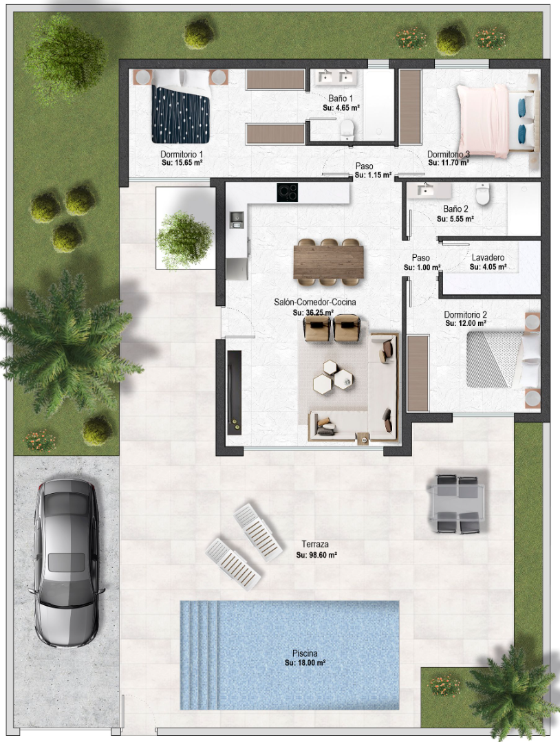 Met trots presenteren we deze prachtige ONE LEVEL villa's op Altaona Golf and Country Club. We willen je graag laten kennismaken met dit geweldige project en de al even prachtige omgeving. Vrolijke, zonnige huizen ontworpen met een levensstijl in gedachten. Ze hebben 2 of 3 slaapkamers en 2 badkamers. De kavelgrootte is 300 m2. Er zijn 4 indelingsopties om uit te kiezen. De verwachte bouwtijd is 10-12 maanden, de showvilla zou eind 2023/begin 2024 klaar moeten zijn.Aangezien deze ontwikkelaar al meer dan 30 jaar actief is, kunnen we andere showhuizen laten zien die al gebouwd zijn, zodat je de kwaliteit en afwerking kunt zien. Interieurfoto's zijn van andere eerdere ontwikkelingen. Dit getoonde model is een woning met 3 slaapkamers en 2 badkamers. Ze zijn allemaal in één plan. Ze liggen allemaal op het zuiden en hebben allemaal een privézwembad van 18 m2. De keuken/eetkamer/woonkamer is 36 m2 en heeft grote glazen deuren naar de tuin/het zwembad. Alle witgoed in de keuken is inbegrepen. De hoofdslaapkamer is 16 m2 en heeft een inloopkast/kleedkamer die leidt naar de ruime aangrenzende badkamer met vloerverwarming, dubbele wastafels en inloopdouche. De twee andere slaapkamers zijn ook goed van formaat (beide meer dan 11 m2) en hebben ingebouwde kasten, en delen de tweede badkamer met vloerverwarming en moderne inloopdouche. Zowel de zitkamer als de slaapkamers bieden toegang tot de tuin. Het verharde deel met het zwembad is 98 m2, het zwembad is 18 m2. LED-verlichting in alle kamers en alle inbouwapparatuur is inbegrepen. Altaona Golf and Country Village is centraal gelegen in met gemakkelijke toegang tot het snelwegennet, dus vrijwel alles is binnen handbereik. Altaona Golf is een schitterende 18-holes golfbaan en een schitterende omgeving. Er is ook een heel mooi nieuw clubhuis met alle faciliteiten, waaronder een pro-shop, restaurant en bar. Het commerciële centrum op het terrein heeft ook een restaurant en bar en andere faciliteiten. De 300 jaar oude boerderij "Parador" moet eind 2025 klaar zijn en meer restaurants en faciliteiten bieden.Afstanden per auto: Vliegvelden: Murcia International 8 min, Alicante 50 minSteden: Murcia stad 10 min, Cartagena 20 minStranden: Mar Menor 22 min, Middellandse Zee 25 min.Scholen: Internationale en lokale 10-15 minuten. Andere: Selectie van supermarkten 10 min, tal van restaurants 5-10 min. We willen je graag laten kennismaken met dit fantastische project en de al even prachtige omgeving. Voor meer informatie kunt u contact opnemen met Soraya op soraya@murciadreams.com