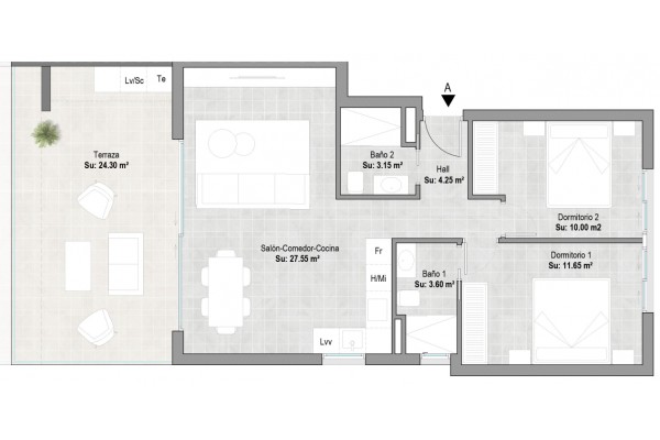 Really nice ground floor apartment, in walking distance to all amenities and only approx 10 min bicycle ride to the fantastic Mediterranean beach at Higuericas.This ground floor apartment has got 2 terraces, one at the entrance to the apartment which is West facing. On the other side towards the communal pool area is the other good size terrace.It consist of open kitchen/lounge with glass doors to the 28 m2 terrace.Kitchen comes with all white-goods (oven, hob, extractor fan, fridge/freezer, dishwasher, microwave and a washing machine).3 good size bedrooms, all with build in wardrobes and one of them have en-suite bathroom and access to the terrace. There is also a 2nd bathroom.Bathrooms got heated floors.There are pre-installation for ducted A/C.There is a communal pool and enclosed storage space for bicycles etc..Pilar de la Horadada is only 1.5 - 2 km from the beaches at the Mediterranean cost. Can easily be reach either walking or on a bike via the rambla which is only a short distance from the property.Playa de las Higuericas is fantastic - including a selection of chiringuitos.Pilar de Horadada has got everything, plenty of restaurants, bars, shops, supermarkeds etc..And a little bit about distances:Town centre 200 m.Mercadona 600 mRestaurants from approx 100m.Airports: Murcia 35 min., Alicante 45 min..Torreviaja 20 min..La Zenia 12 min.Lo Pagan (Mar Menor beaches and mud bath) 10 min..Golf: big selection nearest one is approx 2 km away.