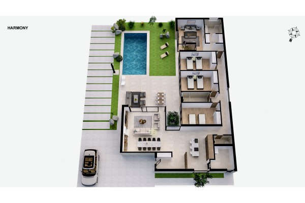 This fantastic development offers from 2 bed, 2 1/2 bath to 6 bed with 4 1/2 bathrooms. This is a 4 bed with 2 bath and a guest toilet. Quite big garden and 8 x 4 meter private pool. From the entrance you have access to the large 62 m2 open kitchen lounge. The italien style kitchen comes with extractor and hub. It also includes a really good size breakfast bar with good room for barstools. Lounge have plenty of space to cater both for a dining area and a sofa area. From the kitchen is also access to 7.1 m2 utility/storage room. The lounge is quite bright as loads of windows including the hold side toward the pool/garden area. From the lounge is also access to the guest toilet and the bedrooms department which consist of the 4 bedrooms, the 22 m2 big "master"one got en-suite bathroom and walk in wardrobe. The 3 other are also large, all over 14 m2 and all got build in wardrobes. They are sharing the 2nd bathroom. Being a luxury development means it is build to the highest standards and comes with: Ducted air-con with heat pump. Underfloor heating in lounge and bathrooms. Home automation Video intercom and much more. Mosa/Altaona Golf is centrally located in with easy access to the motorway network, so pretty much everything is within easy reach. Altaona Golf is brilliant 18 holes golf course and amazing surroundings. There is also a very nice new club house with all facilities including pro-shop, restaurant and bar. The commercial centre on site is expected to open in 2023 and should also provide more on-site facilities like a supermarket, restaurant / bar and service providers. Driving Distances: Airports: Murcia International 8 min, Alicante 50 min Cities: Murcia city 10 min, Cartagena 20 min Beaches: Mar Menor 22 min, Mediterranean 25 min. Schools: International and local 10-15 minutes. Other: Selection of supermarkets 10 min, plenty of restaurants 5-10 min. We would like to introduce you to this amazing project and its equally wonderful surroundings. For more details, please contact local area agent Steen on +34 621 208832 (Also WhatsApp)