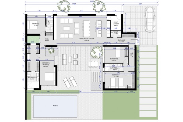 Aan de andere kant van de woonkamer is toegang tot het gebied met de laatste 2 slaapkamers. Ze hebben allebei een en-suite badkamer, een heeft een inbouwkast, de andere is de master bedroom. Deze is echt groot - 28 m2, heeft een inloopkast met veel kasten en zoals gezegd een en-suite badkamer. Het heeft ook directe toegang tot de tuin / het zwembad.