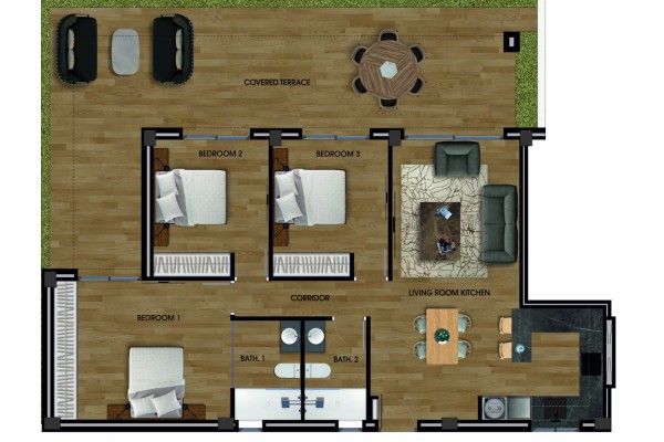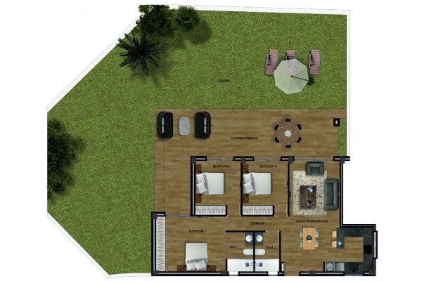The apartment consist of lounge with open kitchen, sliding doors to the 31 m2 west facing terrace and the 183 m2 garden. All 3 bedrooms got sliding doors to the terrrace/garden and have build-in wardrobes. The largest bedroom has en-suite bathroom.