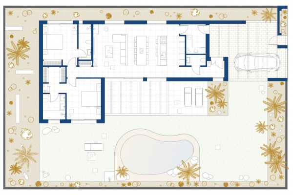 Od wejścia / przedpokoju z toaletą dla gości wchodzisz do otwartego salonu kuchennego o powierzchni 56 m2. kuchnia w stylu włoskim jest wyposażona w wyciąg i koncentrator. Z kuchni jest również dostęp do pomieszczenia gospodarczego o powierzchni 7 m2.