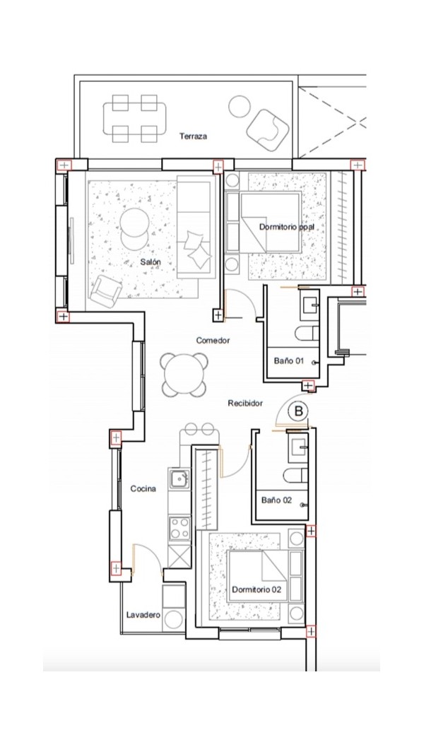 Apartament składa się z wejścia, kuchni z całym sprzętem AGD i dostępem do części gospodarczej, 2 łazienek, 2 sypialni, obie z wbudowanymi szafami, jedna z nich ma łazienkę i dostęp do tarasu.