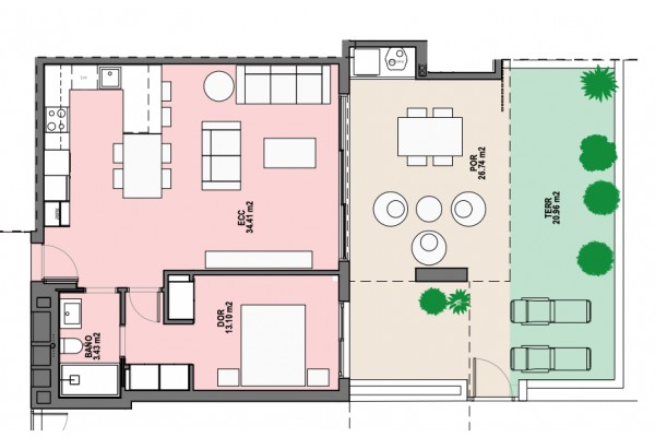 Ładny duży salon ma otwartą kuchnię z wyspą kuchenną, która ma miejsce na stół dla 4 osób na końcu. Kuchnia wyposażona jest w koncentrator i wyciąg. Z salonu są szklane drzwi na taras o powierzchni 47 m2, z czego 27 m2 jest zadaszonych. Sypialnia ma wiele wbudowanych szaf.