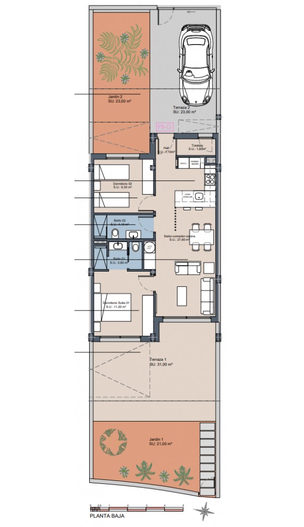 Mieszkanie składa się z salonu z otwartą kuchnią oraz wyjściem na duży taras/ogród przez duże szklane drzwi przesuwne.