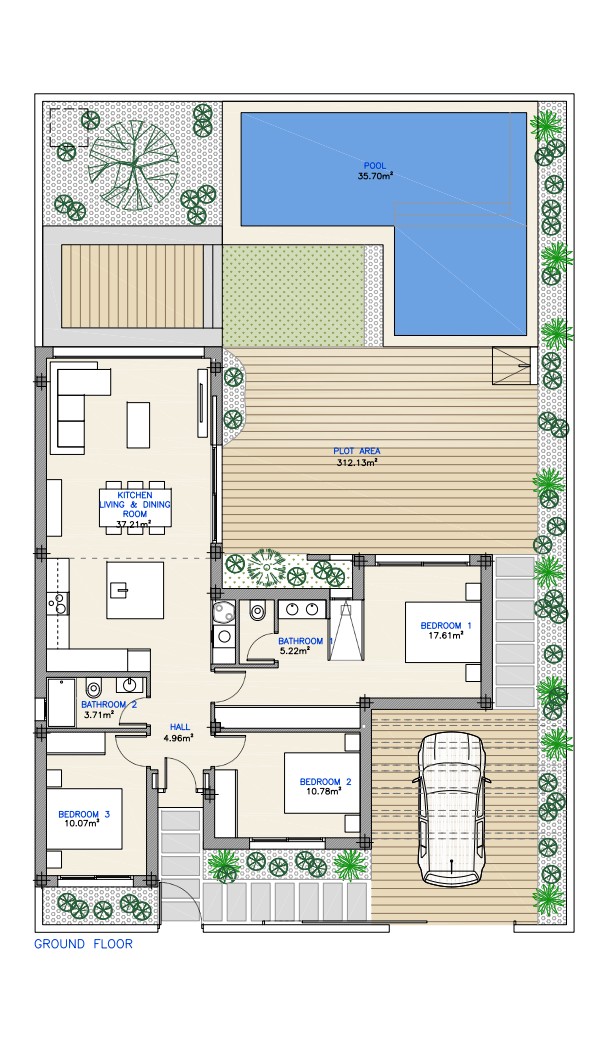 Z kuchni/salonu o powierzchni 37 m2 jest dostęp do dużego tarasu i pięknego basenu o powierzchni 37 m2.