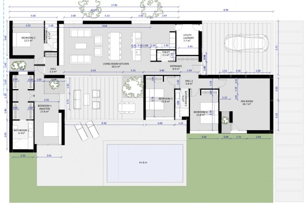 Ta willa w kształcie litery U ma genialny układ z dużymi 5 sypialniami (jedna jest duża - dobra na siłownię lub gry / TV / pokój zabaw), 3 łazienkami i pięknym basenem (8x4), co czyni ją fantastycznym domem rodzinnym lub wakacyjnym.
