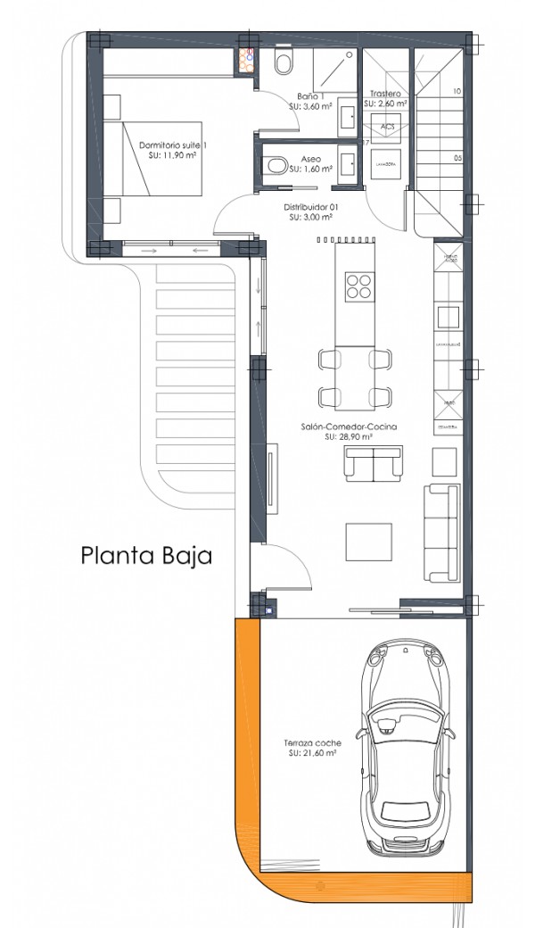 Na parterze znajduje się wiata / taras o powierzchni 21 m2. Salon o powierzchni 29 m2 z otwartą kuchnią ze szklanymi drzwiami do ogrodu. Na pierwszym piętrze znajduje się również główna sypialnia z wbudowanymi szafami, łazienką i dostępem do ogrodu. Na tym piętrze znajduje się również toaleta dla gości i schowek pod schodami na pierwsze piętro