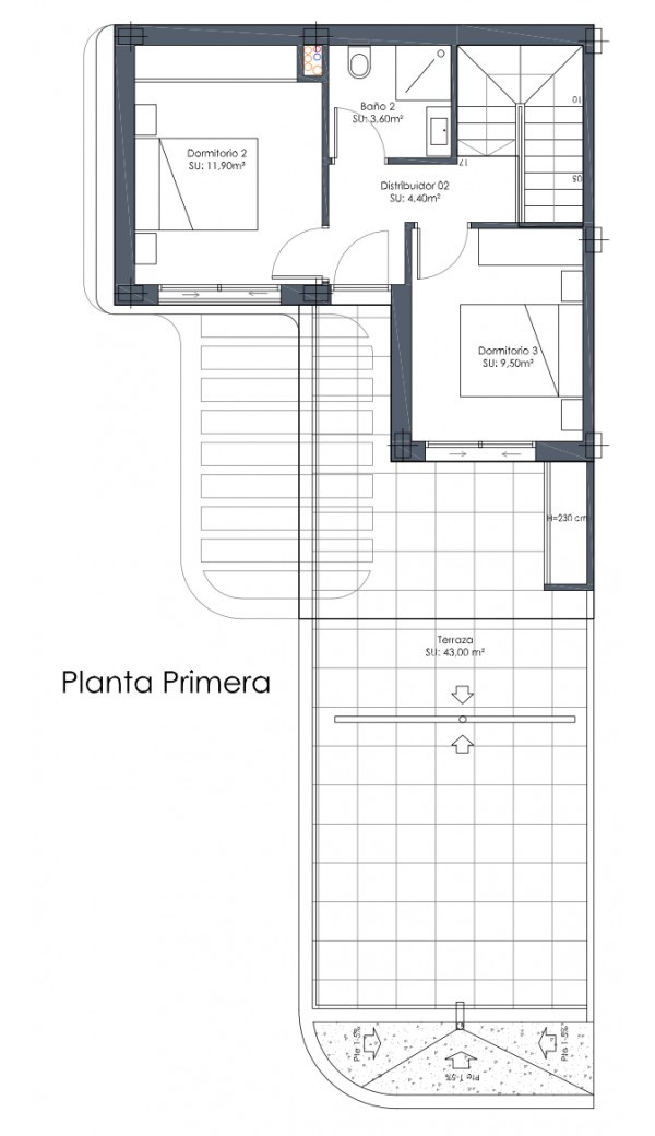 Na pierwszym piętrze znajdują się 2 pozostałe sypialnie i druga łazienka. Obie sypialnie mają wbudowane szafy, jedna z nich ma również bezpośredni dostęp do tarasu o powierzchni 43 m2.