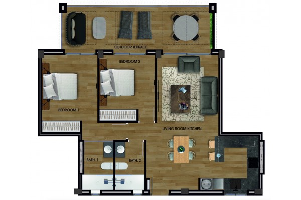 Apartament składa się z salonu z otwartą kuchnią, przesuwanymi drzwiami na taras o powierzchni 18 m2 od strony zachodniej. Dwie sypialnie mają przesuwane drzwi na taras i wbudowane szafy. Największa sypialnia posiada łazienkę.