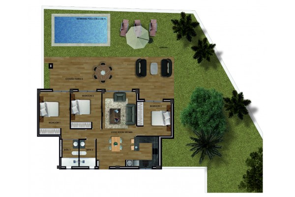 Lovely garden apartment with west facing terrace and garden. Front line golf. 3 bed, 2 bath apartment. Walking distance to golf course, the beaches and Old town of Los Alcazares.One of a very few with own pool.The apartment consist of lounge with open kitchen, sliding doors to the 30 m2 west facing terrace and the 175 m2 garden. All 3 bedrooms got sliding doors to the terrrace/garden and have build-in wardrobes. The largest bedroom has en-suite bathroom.The complex will have 244 apartment with a lot of communal facilities like large pool, padel court, out door gym and playground.There are pre-installations for ducted A/C (and heating).Each apartment got its own parking space and storage room in the underground carpark. The development is only approx 15 min walk from the beaches and old town Los Alcazares, which lovely restaurants, bar, shows, marina and the 4 km long beach promenade to Los Narejos.A little bit about distances:Golf: walking distance - plus 2 more in 5 km radius.Shopping centre, big supermarkeds - 5-10 min drive.Airports: Murcia 25-30 minn, Alicance 50-55 min..Towns: Cartagena 15 min..,, Murcia City 35 min..For more details or arranging of viewing of development and area, please contact Steen on +34 621 208832 (Also WhatsApp)