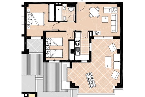 It consist of a god size lounge with glass doors to the 30 m2 covered terrace.