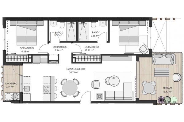 This lovely apartment got 2 bedrooms and 2 bathrooms, a 13 m2 south facing terrace. Good size lounge with open kitchen (included all white goods). From the kitchen is also access to the utility area. Both bedrooms got build in wardrobes. The master one also got e-suite bathroom. Also a second bathroom.
