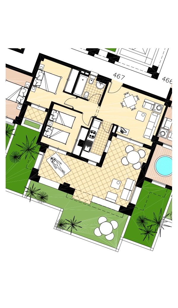 The apartment is very close to one of the large communal swimming pools and conveniently only 4-5 mins walk away from the clubhouse, with restaurant, supermarket, bar, golf pro-shop, condominium and massage.