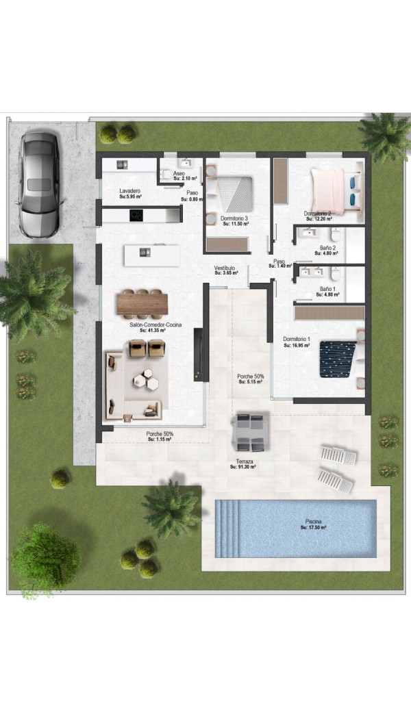 This model has a brilliant layout, it is 3 bed, 2 baths, guest toilet on a 357 m2 plot.