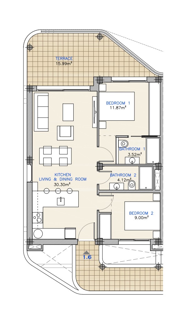 Really nice apartment with views, very close to golf course and not far from beaches and Los AlcazaresIt consist of open kitchen/lounge, 2 bedrooms and 2 bathrooms.From the 30 m2 kitchen/lunge is access to the 16 m2 terrace. Both bedrooms got build in wardrobes, the master one also got en-suite bathroom.The development is only approx 1500 m from beach and old town Los Alcazares, which lovely restaurants, bar, shows, marina and the 4 km long beach promenade to Los Narejos.A little bit about distances:Golf: walking distance - plus 2 more in 5 km radius.Shopping centre, big supermarkeds - 5-10 min drive.Airports: Murcia 25-30 minn, Alicance 50-55 min..Towns: Cartagena 15 min..,, Murcia City 35 min..