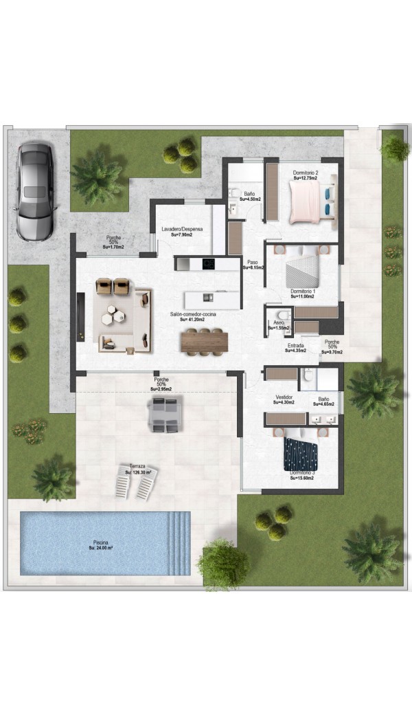 This model is 3 bed, 2 1/2 baths on a 357 m2 plot.