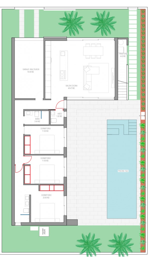 In the hallway is a guest toilet and there is access to the garage (4th bedroom) and bedrooms section with the 3 bedrooms and 2 bathrooms. The master bedroom got en-suite bathroom . All 3 bedrooms got access tot the pool/garden area. They also got build in wardrobes and electric shutters.
