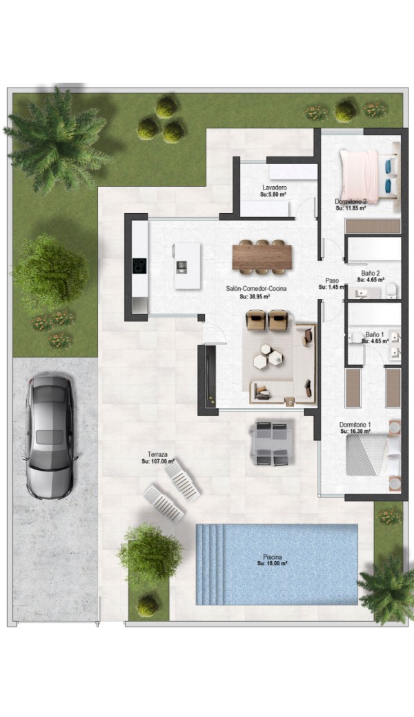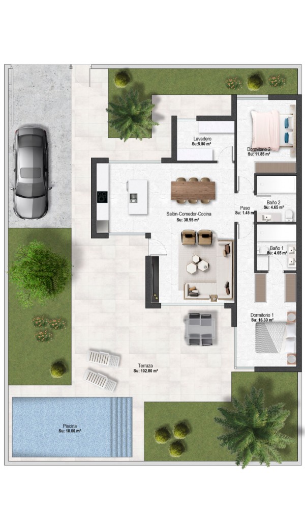 We are proudly presenting these really nice “ONE LEVEL” villas on Mosa/Altaona. Cherry, sunny homes designed with an outdoor lifestyle in mind. They come with either 2 or 3 bedrooms and have 2 bathrooms. * They are all in one plan. * All of them are South facing. * Tiles and kitchen worktop etc are supplied by Porcelanosa. * They all have 18 m2 private pools. * All white goods are included. * Heated floors in bathrooms. * Electric blinds in all bedrooms * LED lights in all rooms. * Pre-installation for ducted air-conditioning. This model is with 2 bedrooms, 2 bathrooms on a 300 m2 plot. The kitchen/dinner/lounge is 39 m2 and has large glass doors to the garden/pool area. All white goods are included in the kitchen. From the kitchen as access to the good size utility room. Master bedroom is 16 m2 and has a walk-in wardrobe which leads to the nice bathroom with double sinks and walk-in shower. Nice big glass area and glass doors to the garden/poll area. The other bedroom also has a good sizes (12 m2) and comes with built-in wardrobes.. The second bathroom also has double sinks and a big walk-in shower. Both the lounge and the bedrooms have access to the garden. The paved part, with the pool is 107 m2, the pool is 18 m2. There is also a terrace on the other side of the house. Expected built time is 10-12 months, Interior photos are from other previous developments.Altaona Golf and Country Village is centrally located with easy access to the motorway network, so pretty much everything is within easy reach. Altaona golf is a nice 18 holes golf course in amazing surroundings. There is also a very nice new club house with all facilities including pro-shop, restaurant and bar. The commercial centre also got restaurant and bars etc.. The 300 old farmhouse "Parador" is expected to be renovated open by the end of 2025 and will provide even more restaurants and facilities. Airports: Murcia International 8 min, Alicante 50 min Cities: Murcia city 10 min, Cartagena 20 min Beaches: Mar Menor 22 min, Mediterranean 25 min. Schools: International and local 10-15 minutes. Other: Selection of supermarkets 10 min, plenty of restaurants 5-10 min We would like to introduce you to this amazing project and its equally wonderful surroundings. For more details, please contact local area agent Steen on +34 621 208832 (Also WhatsApp)