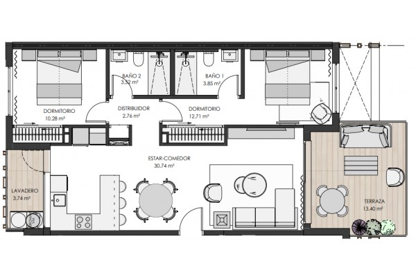 Apartment in new development on Santa Rosalia Lake and Life resort. . The gated resort is based around a lake - Crystal Lagoon. There are beaches, Islands, beach volley, a jetty and recreation areas. Beach club with restaurant and bar, one of the islands and the Adventura golf also got a bars. Other facilities are a large gym, DiscGolf, Adventure golf, pétanque, ping pong, chess, yoga area, multi sports tracks and more. Less than 5 min from 18 holes golf course and about same distance to Old Los Alcazares and the Mar Menor beaches. This lovely apartment got 2 bedrooms and 2 bathrooms, a 13 m2 south facing terrace. Good size lounge with open kitchen (included all white goods). From the kitchen is also access to the utility area. Both bedrooms got build in wardrobes. The master one also got e-suite bathroom. Also a second bathroom. On top of the Santa Rosalia Lake and life resorts facilities, this community also have communal pools – one of them heated. A few featured specifications: •Community swimming pool. •Kitchen completely furnished and equipped with oven and microwave in column, integrated dishwasher and glass finished fridge, induction hob and extractor fan. •LED Lighting: inside the property (kitchen, corridors and bathrooms), as well as in outdoor areas. •Lined wardrobes with drawers. •Motorised blinds in bedrooms. •Fully fitted bathrooms with vanity unit, toilet, mirror, shower and shower screens. •Heated floors in bathrooms. •Ducted A/C and heating included. •Parking space and storage room in the basement This lovely complex and the development is in a fantastic location. Next to golf club and close to the beaches of Mar Menor. A bit about distances: Beaches: Resorts Crystal Lagoon: walking distance others 5-8 min drive. Towns/cities: Los Alcazares 5-8 min., Cartagena 20 min., Murcia City 35 min. Airports: Murcia international 25 min., Alicante 55 min.. Golf: 5 min, approx 20 in max 30 min drive.For more information please contact area agent Steen on +34 621 208832 (Also WhatsApp) or contact us via email or website.