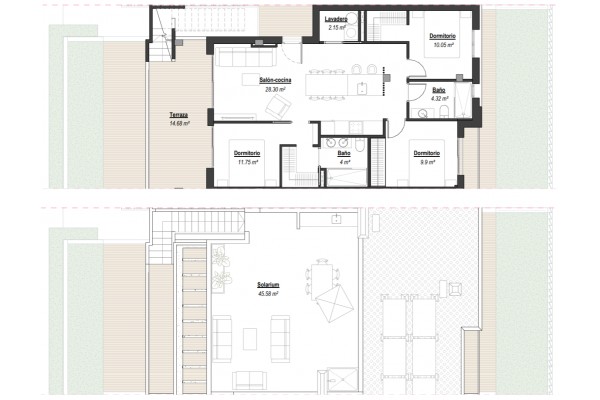 Really good layout - 28 m2 lounge with open kitchen, from kitchen access to the washing room. The lounge sliding doors to the 15 m2 terrace from where there is access to the large solarium.The master bedroom, got walk-in wardrobe, en-suite bathroom and access to the south facing terrace. The 2 other bedrooms got build in-wardrobes, one of them a walk-in version. Second bathroom got a good size walk-in shower. From the terrace is access to the 46 m2 solarium which is prepared for outdoor shower and summer kitchen.