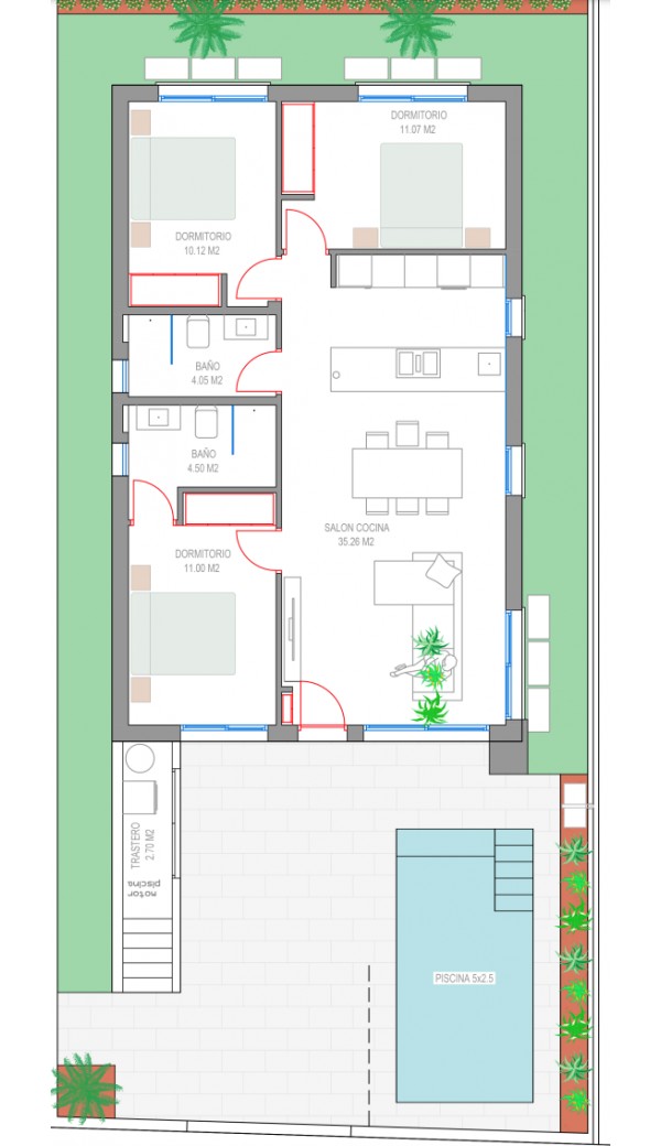 Really good layout villa, with 5 x 2.5 pool and massive 87 m" solarium on the roof. It has a 35 m2 big lounge with open kitchen. Lounge got large glass doors to the pool and garden. Kitchen comes with all white goods - high quality by MIELE.The bedroom section consist of the 3 bedrooms and 2 bath rooms. All bedrooms got floor to ceiling build in wardrobes. The master one also got en-suite bath and direct access to the pool/garden area. The 2 other bedrooms got access to the back garden.From the garden is a staircase leading to the massive 87 m2 solarium on the roof. Underneath the staircase is storage space which include washing machine and all the technical stuff for the pool.The pool is 5 x 2.5 m. Also comes with outdoor shower and is prepared for heating.Heating and A/C comes via a central ducted sytem.The development is only approx 5 - 10 min walk from supermarket, restaurant, bars and shopping. San Javier town centre is 1.5 km away.The lovely beach and the love town Santiago de la Ribera is only 2.5 km away. Nearby town and beaches in Los Alcazares is 6 km from the villas.A little bit about distances:Golf: large selection in the area, the nearest one is 8 minutes drive away.Big supermarket 5-10 min walk, commercial centre 10 min drive..Airports: Murcia 25 min, Alicante 55 min..Towns: Cartagena 25 min..,, Murcia City 30 min..Torrevieja 30 min., Los Alcazares 5 min..