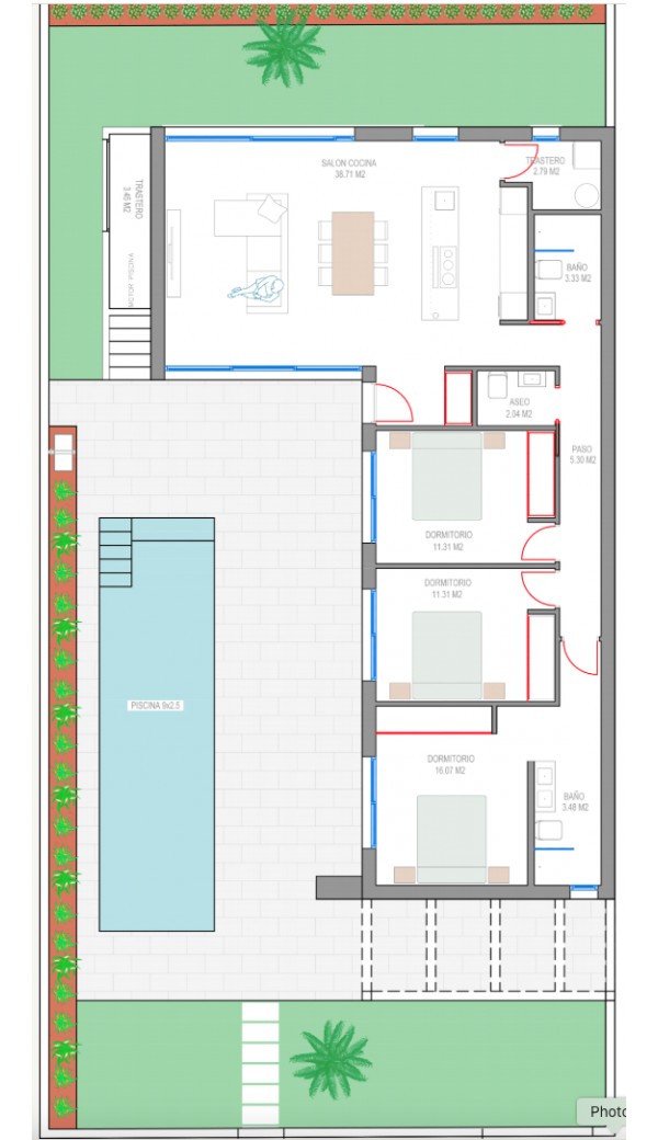 Really good layout villa, with good size pool and a massive 103 m" solarium on the roof. Photos are from a similar villa but with a different layout.It has as 34 m2 big lounge with open kitchen. Lounge got large glass doors to the pool and garden. Kitchen comes with all white goods - high quality by MIELE.All 3 bedrooms got floor to ceiling build in wardrobes. The master one also got en-suite bath and direct access to the pool/garden area. The 2 other bedrooms got access to the front garden. From the garden is a staircase leading to the massive 103m2 solarium on the roof. The pool is 6 x 2,5. Also comes with outdoor shower and is prepared for heating.Heating and A/C comes via a central ducted sytem.The development is only approx 800 from beach and old town Los Alcazares, which lovely restaurants, bar, shows, marina and the 4 km long beach promenade to Los Narejos.Shopping and supermarked less than 5 minutes walk from the villas.Key features:- Walking distance to supermarked, beach, town and golf.- 6 x 2.5 m pool.- Massive 103 m2 solarium- Ducted A/C - heating included.- All white goods included. Brand MIELE or similar. Induction hob with build-in extractor- Electric towel rails in the bathrooms.- Irrigation system.- Quadruple glazing glass with air chamber and sun projection.- Pre-installation for pool heat pump.A little bit about distances:Golf: walking distance - plus 2 more in 5 km radius.Shopping centre, big supermarkeds - 5-10 min drive.Airports: Murcia 25-30 minn, Alicance 50-55 min..Towns: Cartagena 15 min..,, Murcia City 35 min..